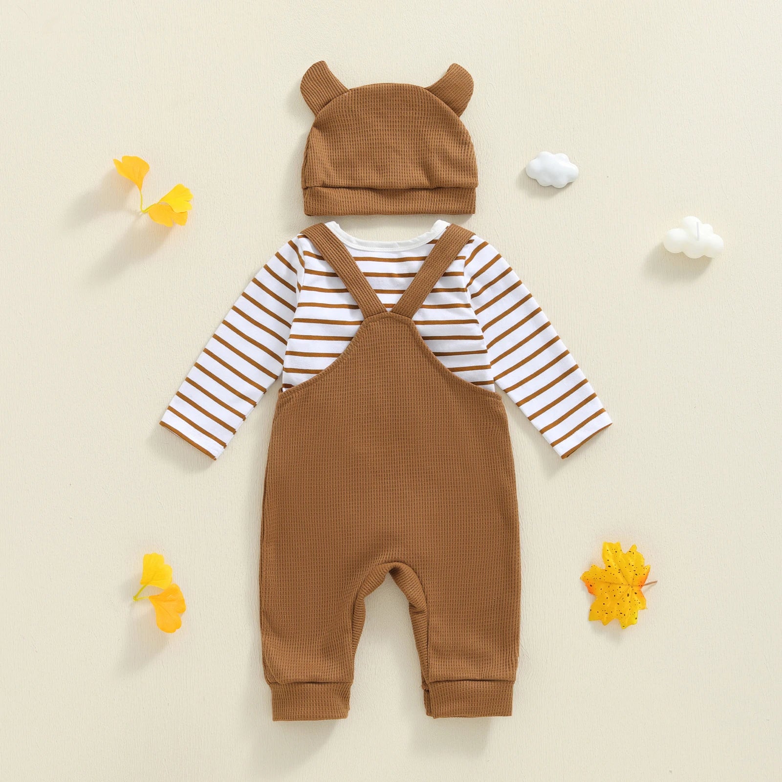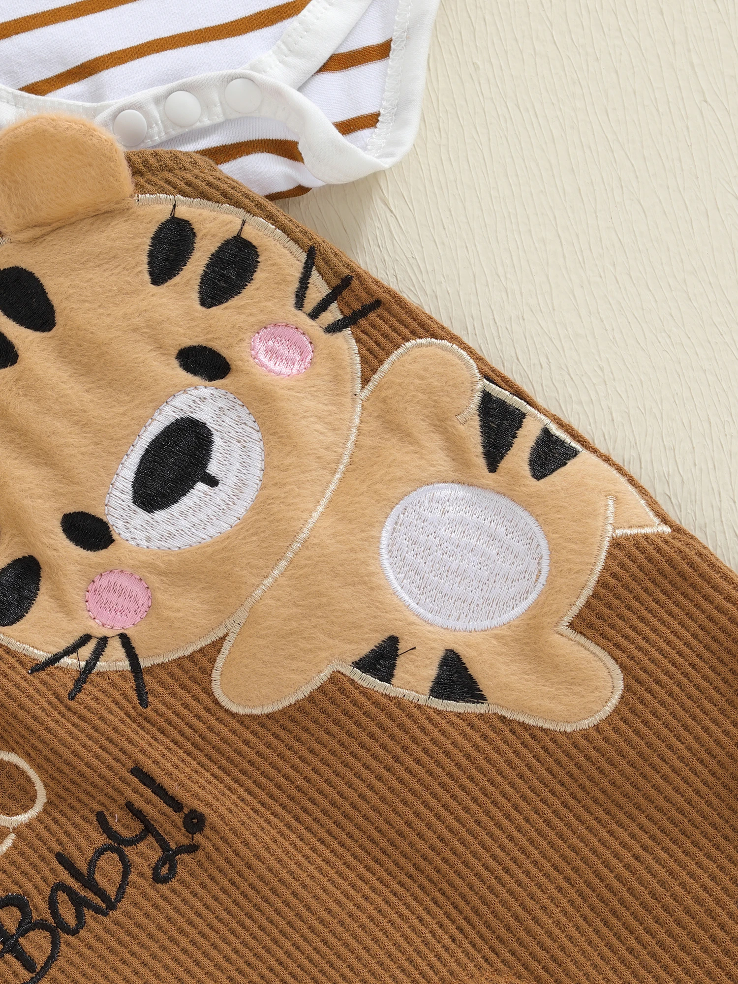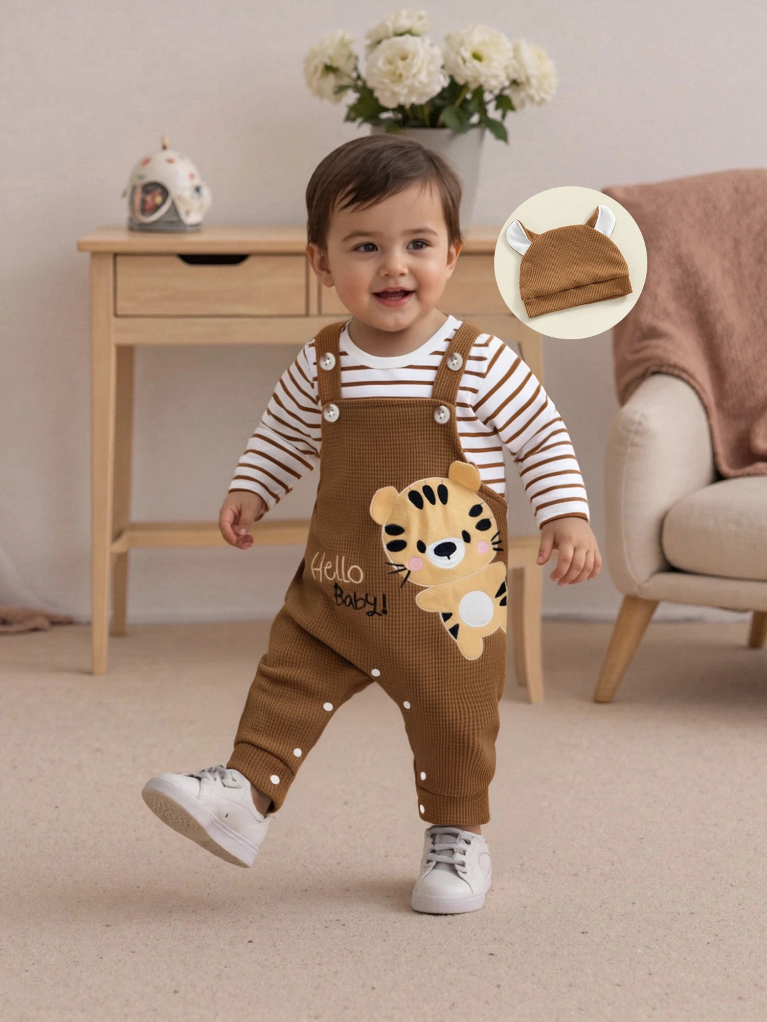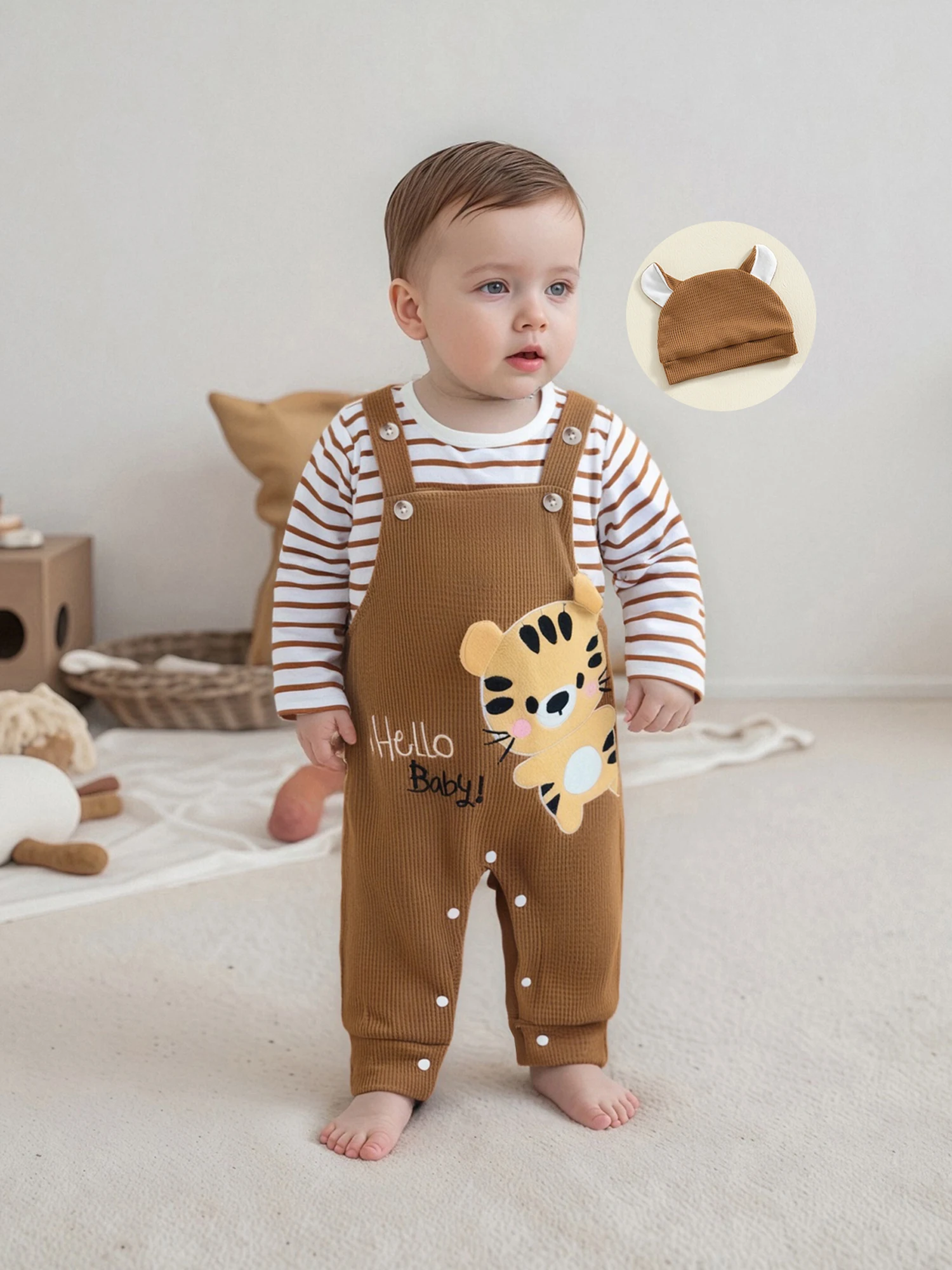 Baby Boy's Clothing Sets Fashionable Long Sleeve Striped Romper with Tiger Embroidered Overalls and Hat 3Pcs Outfits